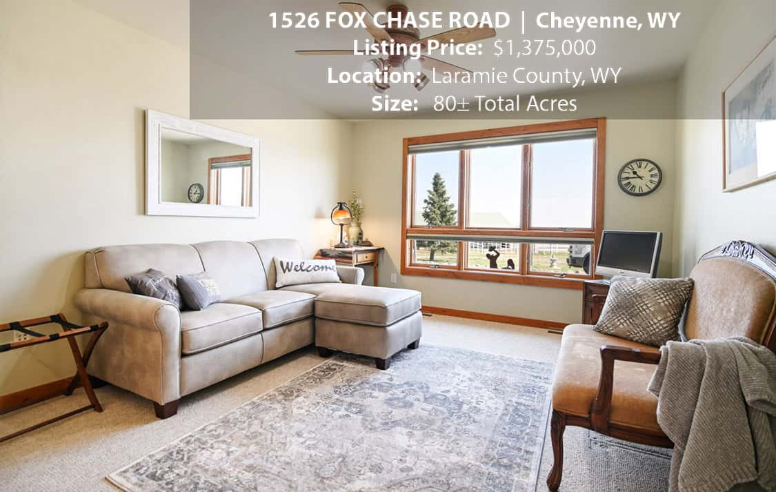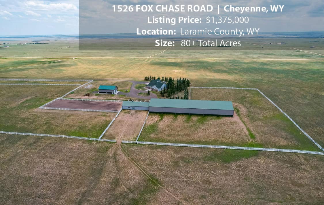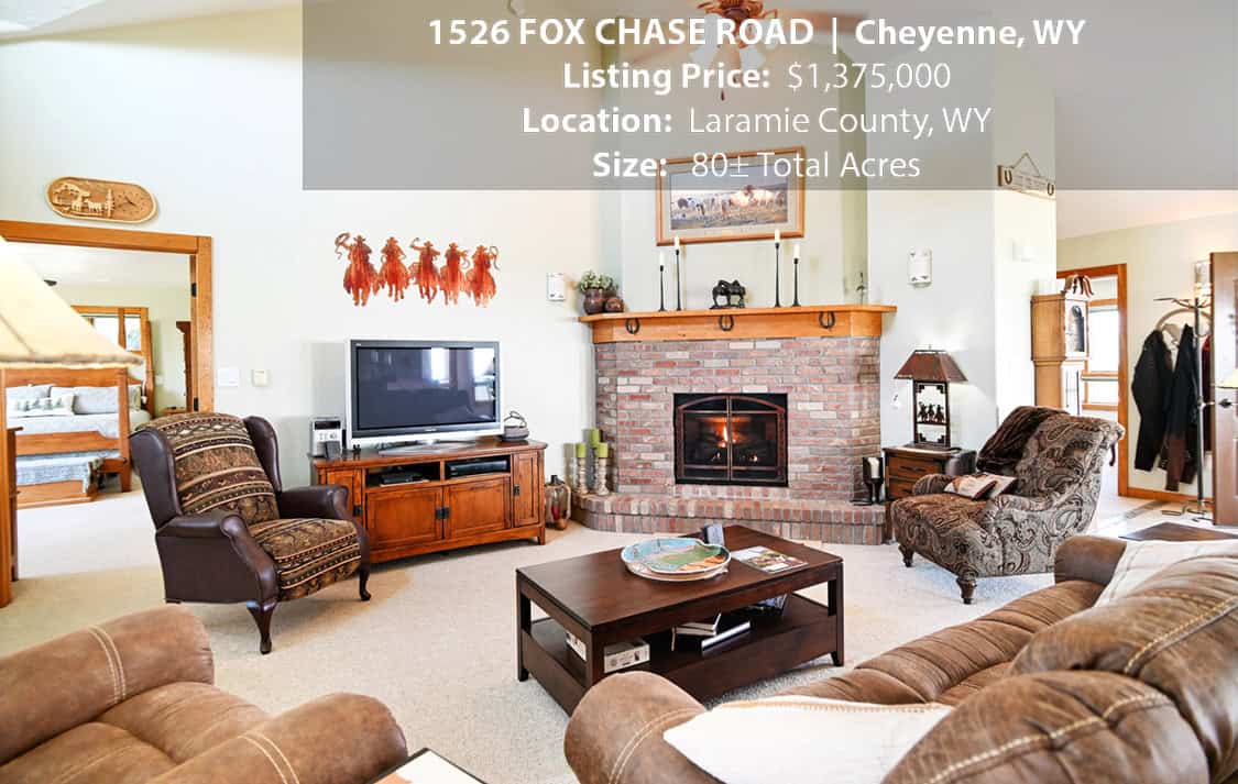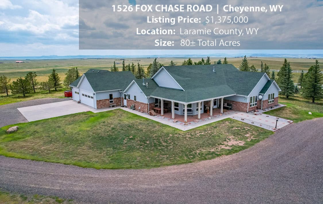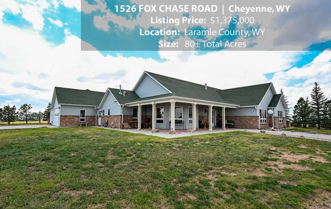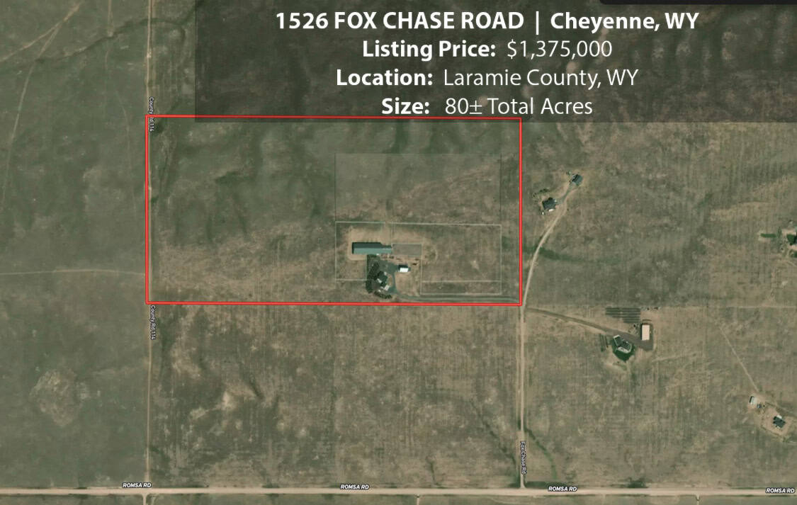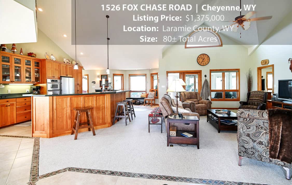 • Situated on 80± deeded acres just west of Cheyenne, Wyoming is this turn-key property featuring a 2,518 sq ft, 4 bedroom, 2.5 bath, open floorplan home with vaulted ceiling, gas fireplace, attached sun room/patio, 36” wide doors, and an extended 3 car attached garage.