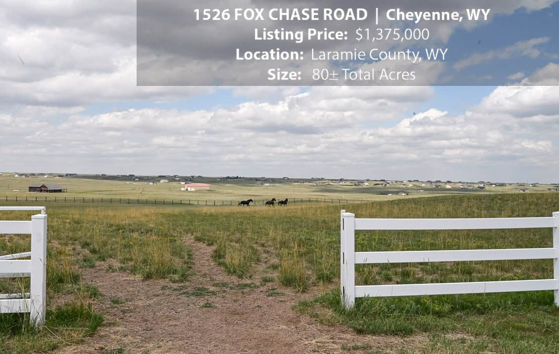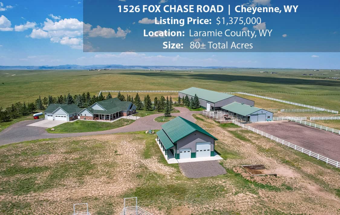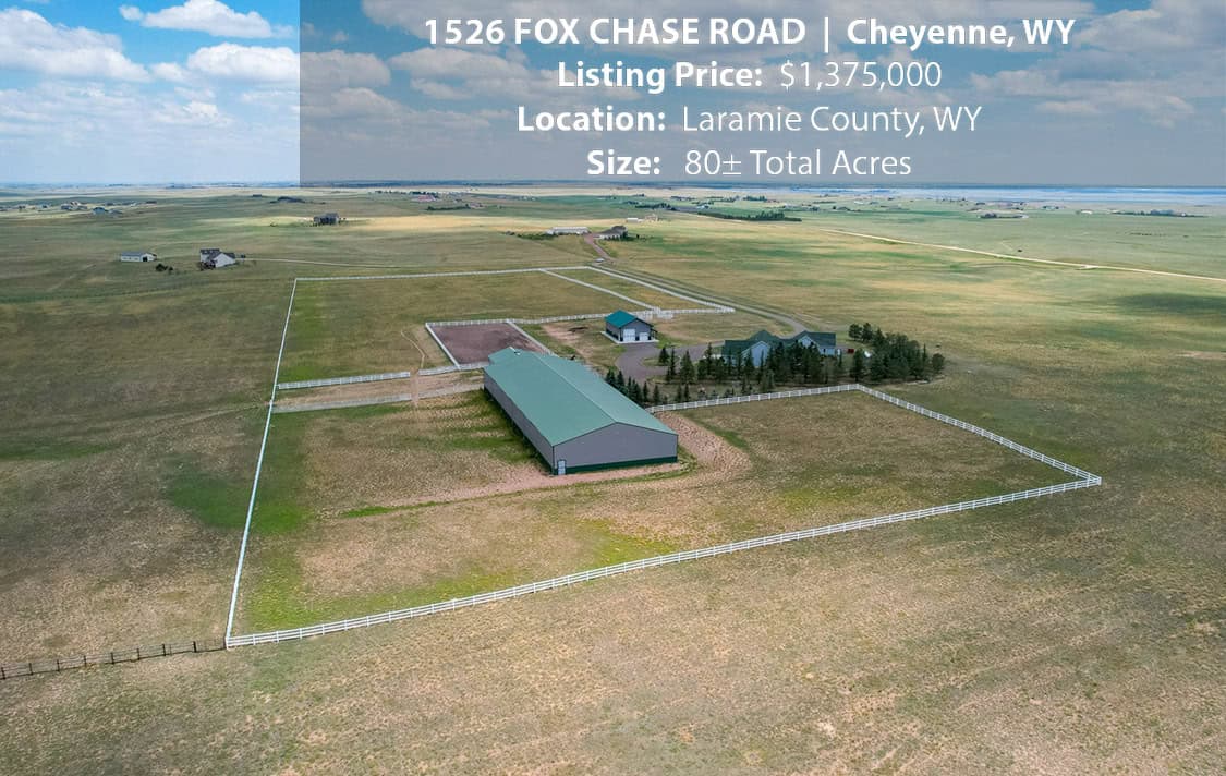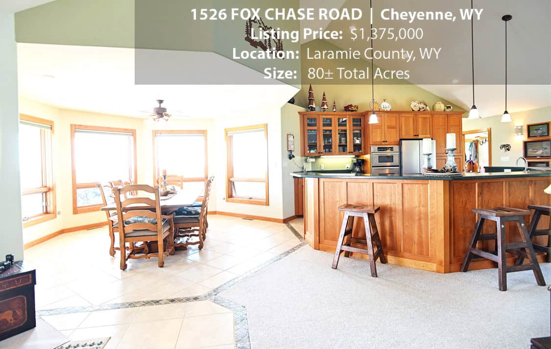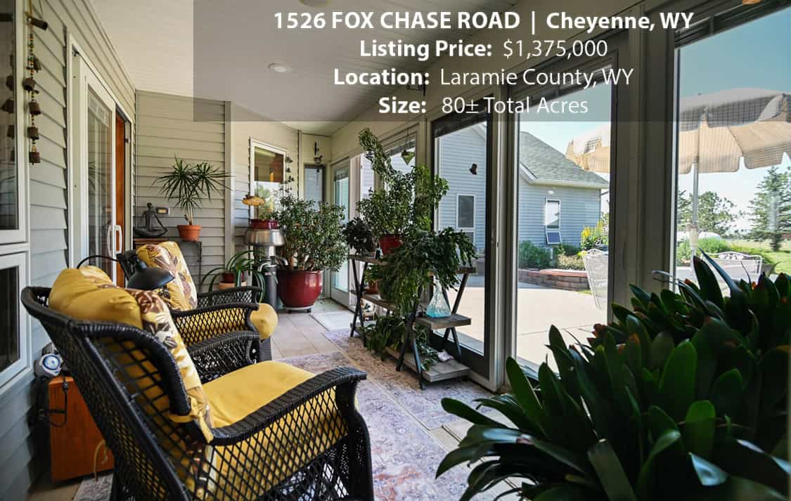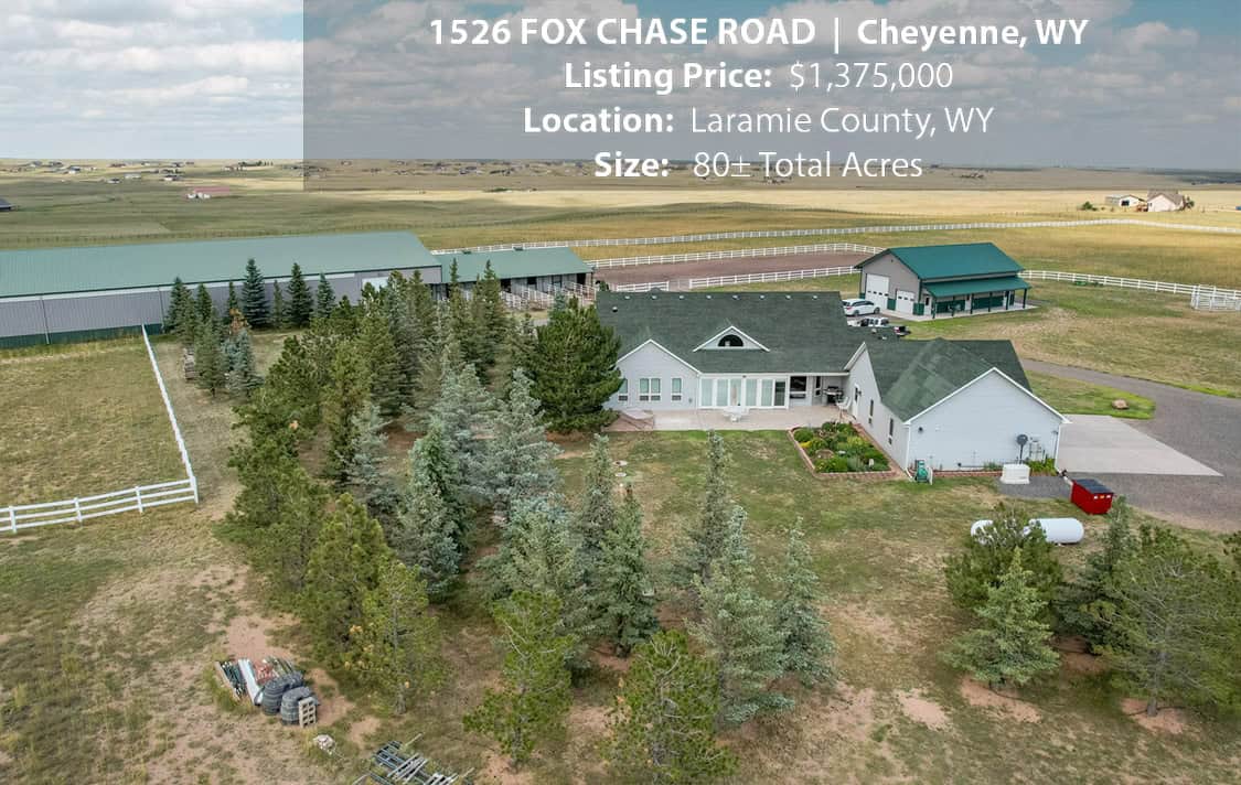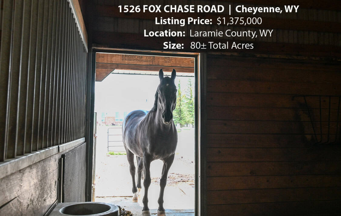 • Situated on 80± deeded acres just west of Cheyenne, Wyoming is this turn-key property featuring a 2,518 sq ft, 4 bedroom, 2.5 bath, open floorplan home with vaulted ceiling, gas fireplace, attached sun room/patio, 36” wide doors, and an extended 3 car attached garage.