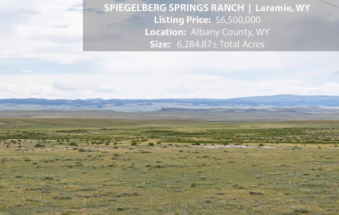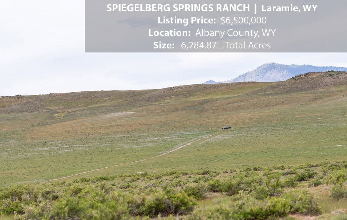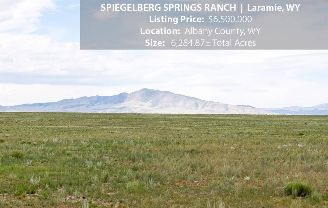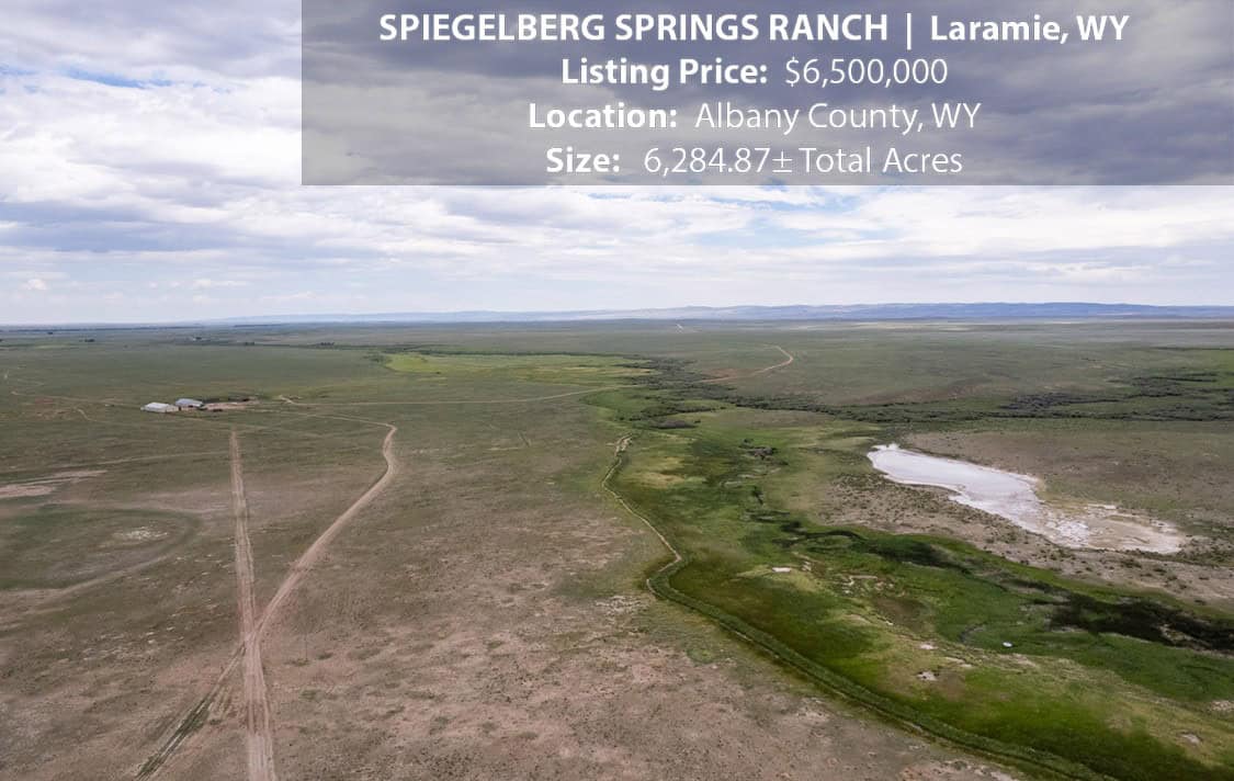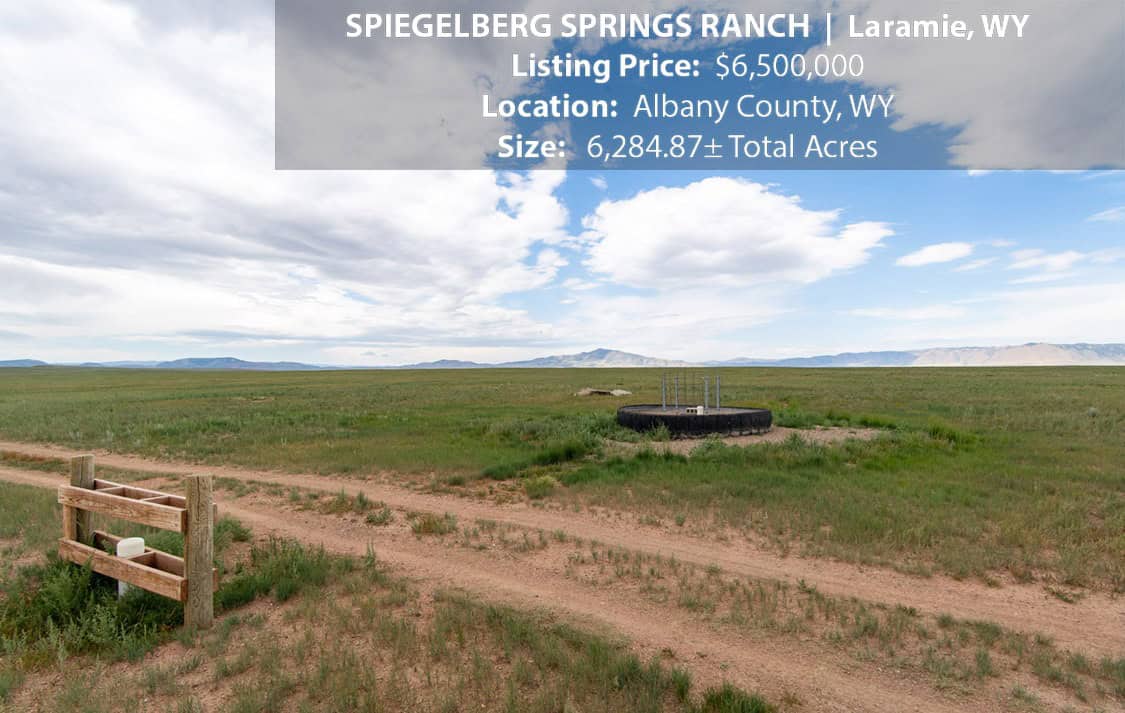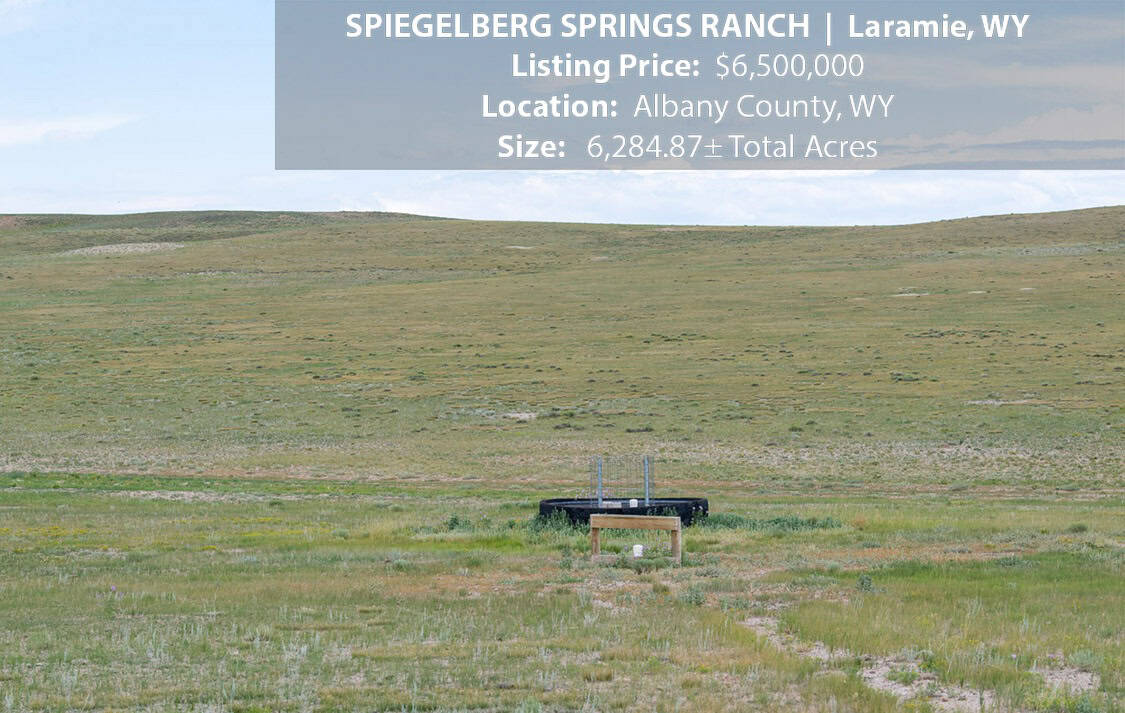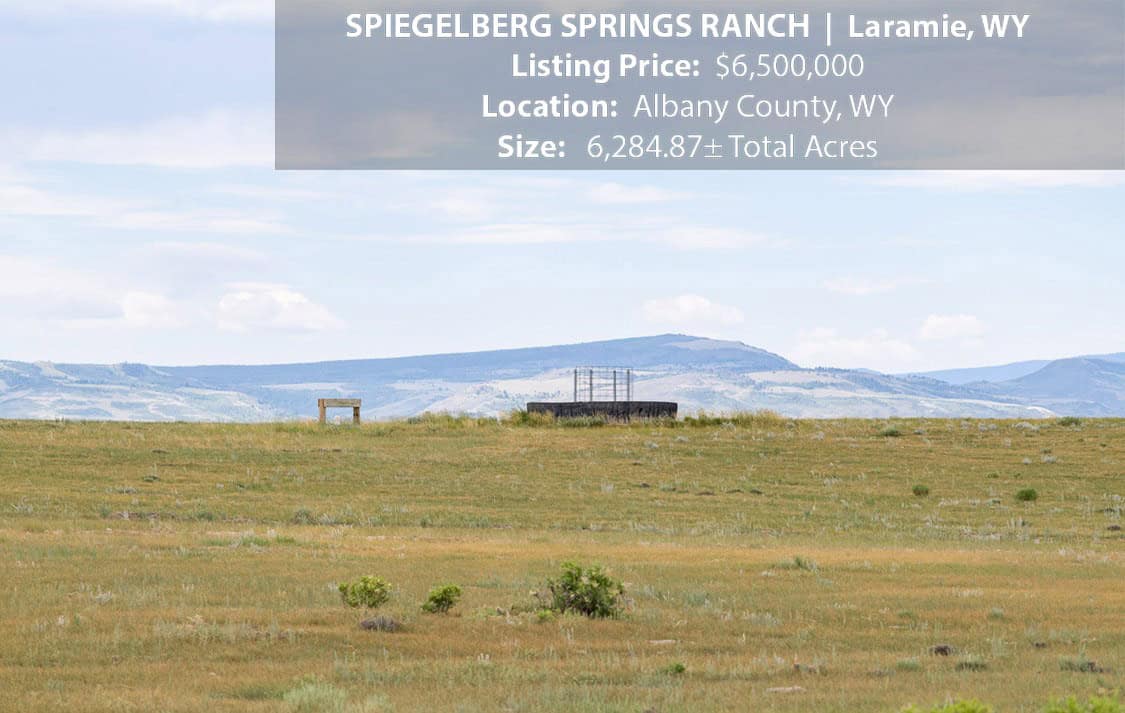 • Located approximately 19 miles southwest of Laramie, Wyoming and surrounded on three sides by the Laramie Mountains, the Spiegelberg Springs Ranch consists of 6,284.87± total acres of which 5,019± acres are deeded and 1,265± acres are State of Wyoming lease acres.