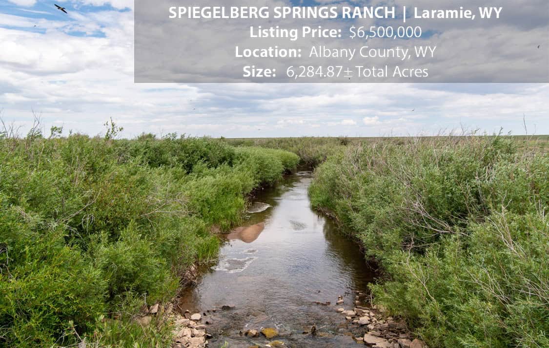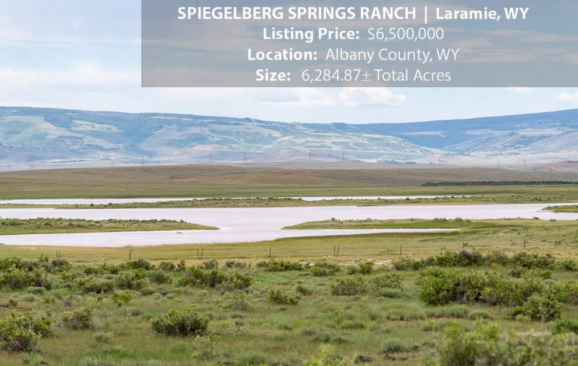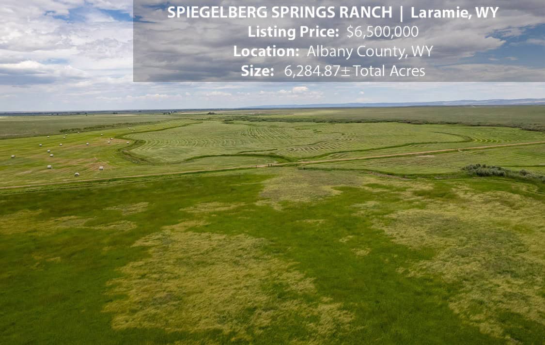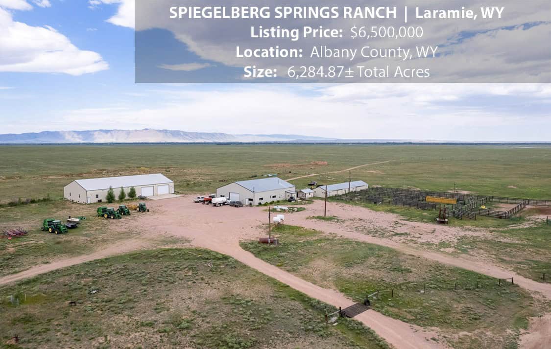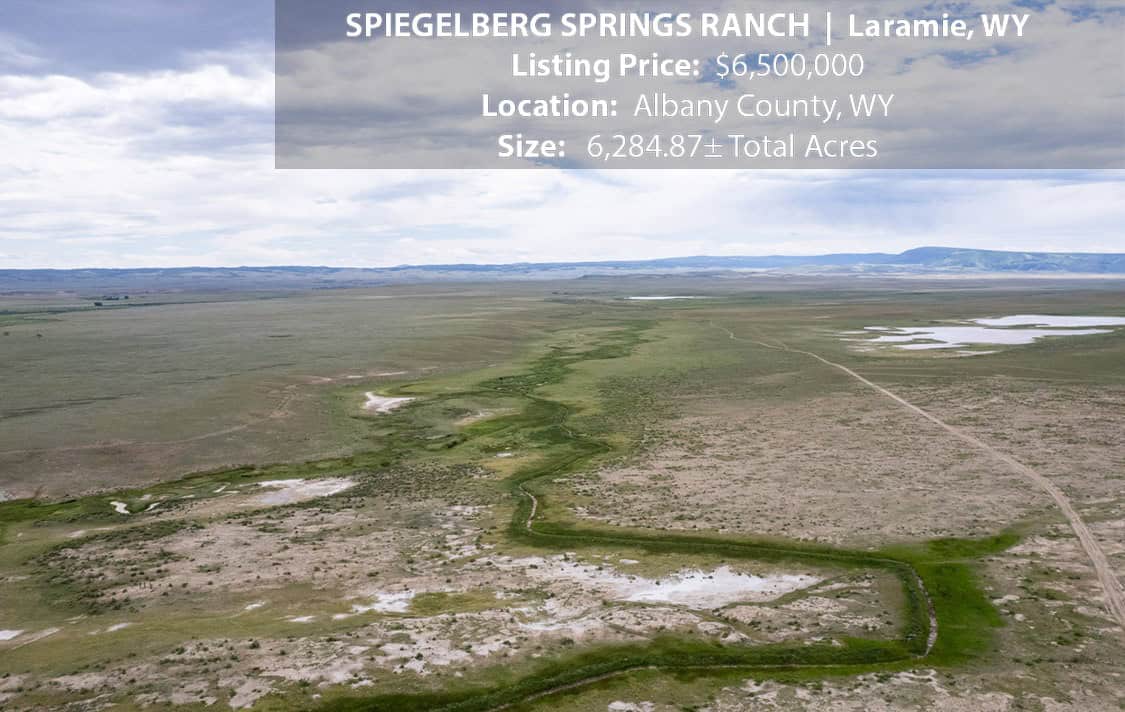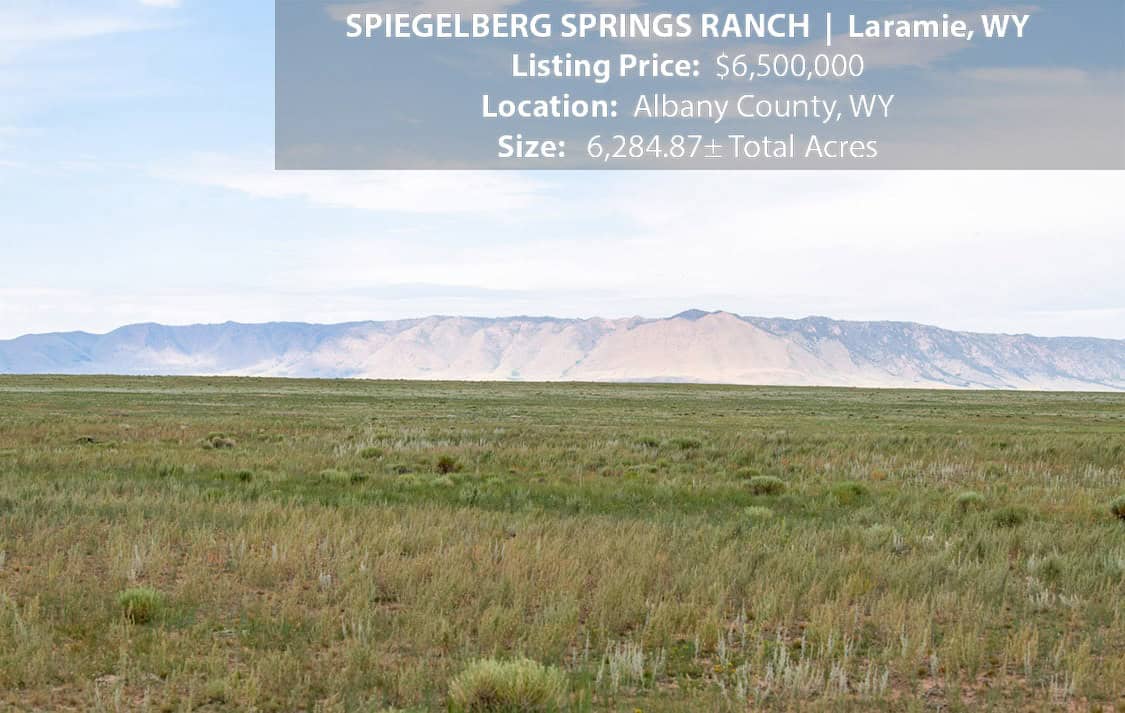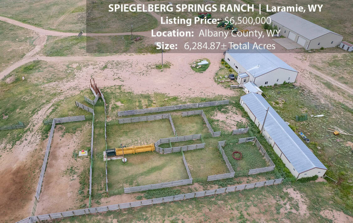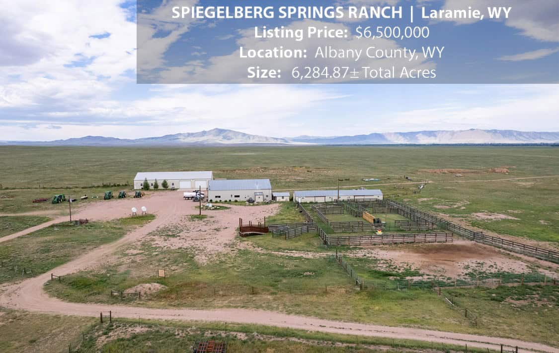 • Located approximately 19 miles southwest of Laramie, Wyoming and surrounded on three sides by the Laramie Mountains, the Spiegelberg Springs Ranch consists of 6,284.87± total acres of which 5,019± acres are deeded and 1,265± acres are State of Wyoming lease acres.