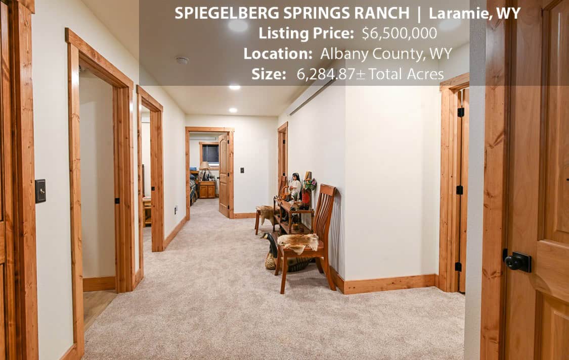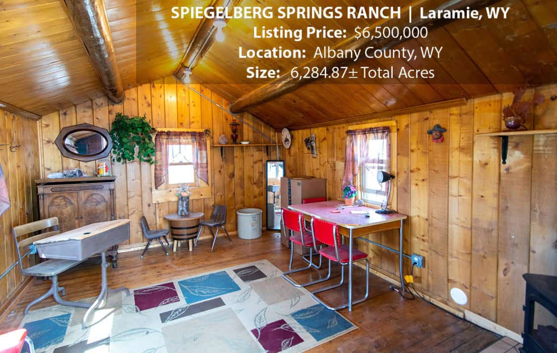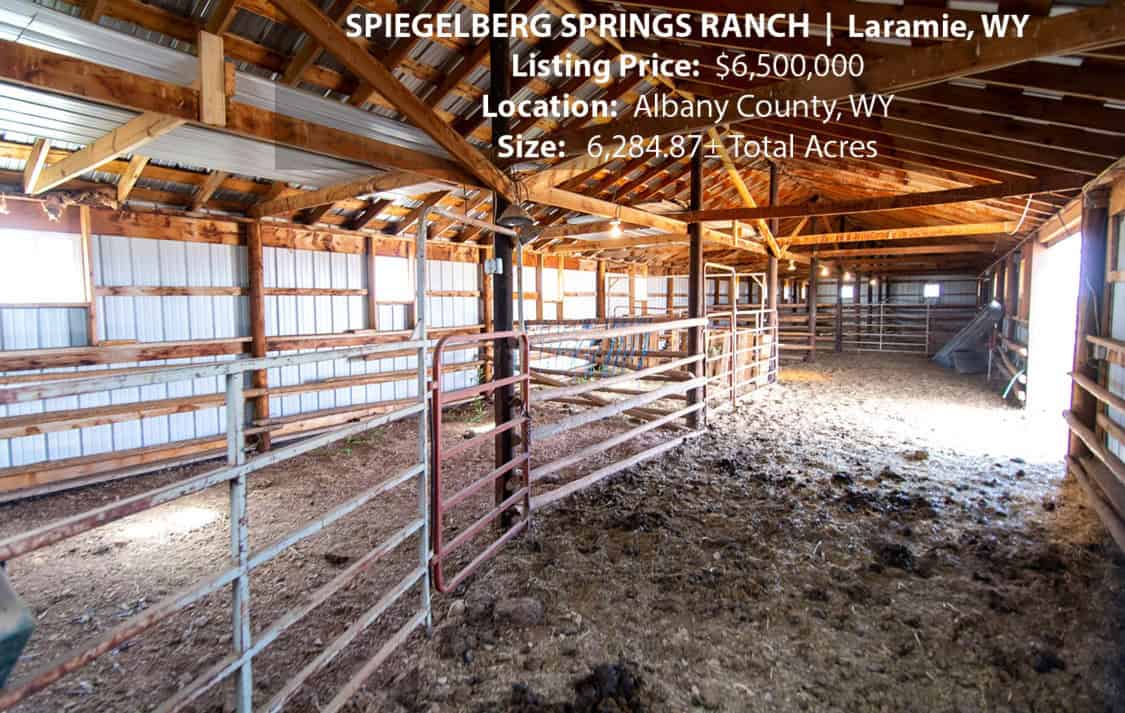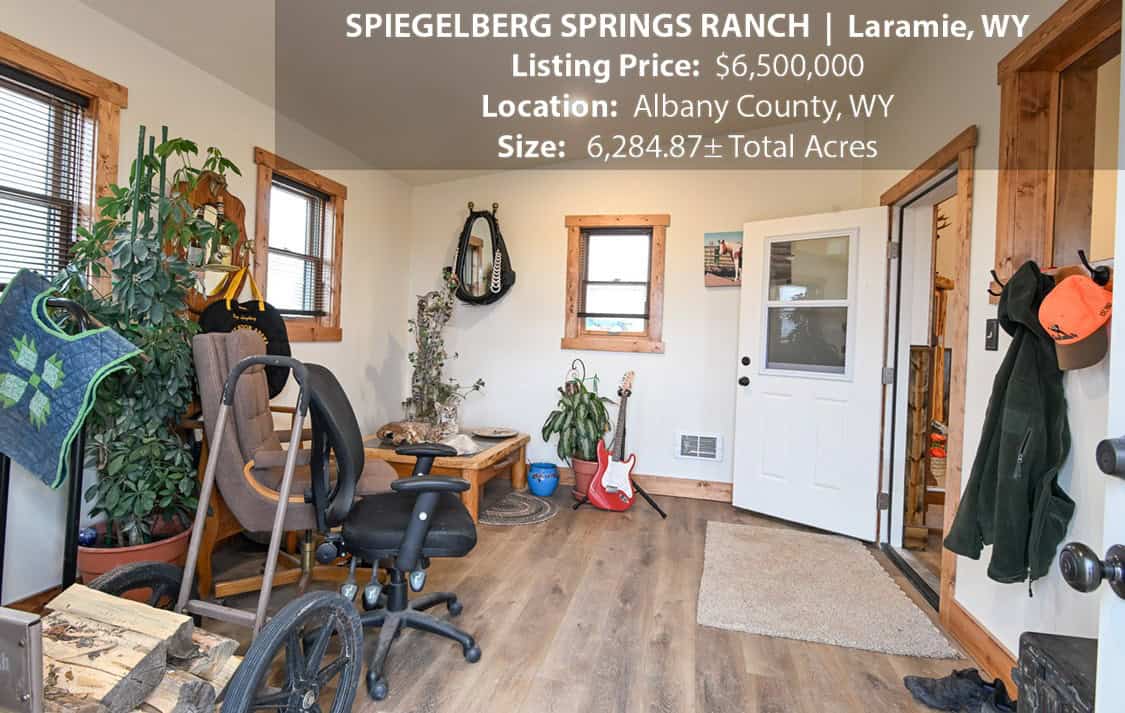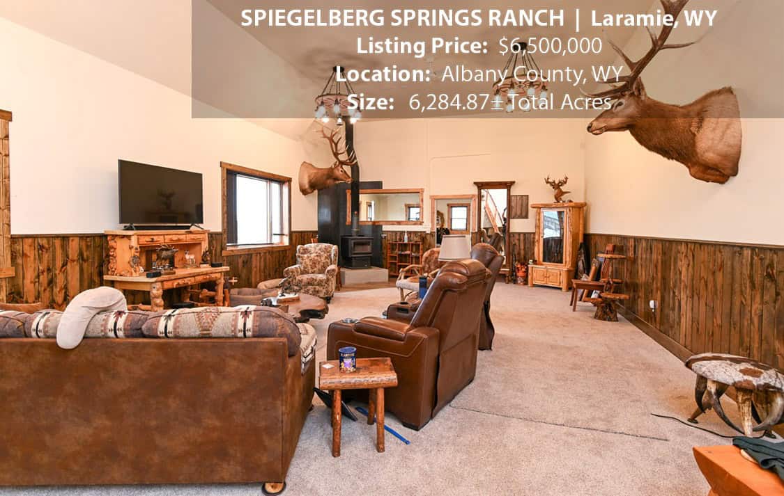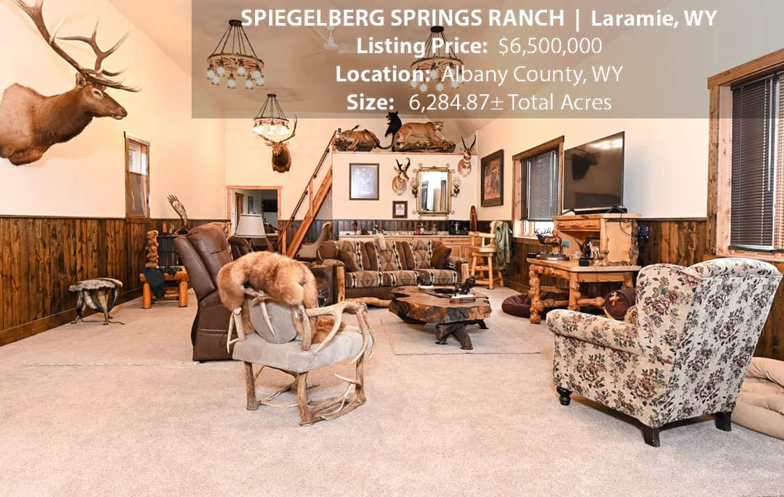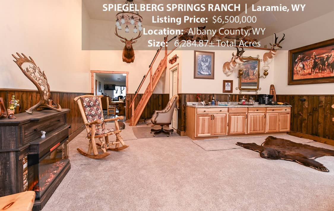 • Located approximately 19 miles southwest of Laramie, Wyoming and surrounded on three sides by the Laramie Mountains, the Spiegelberg Springs Ranch consists of 6,284.87± total acres of which 5,019± acres are deeded and 1,265± acres are State of Wyoming lease acres.