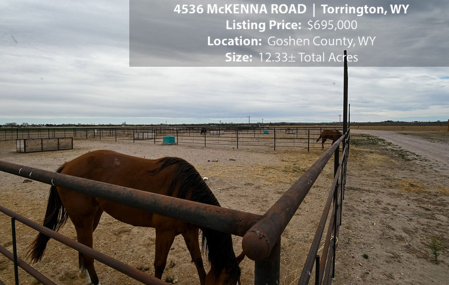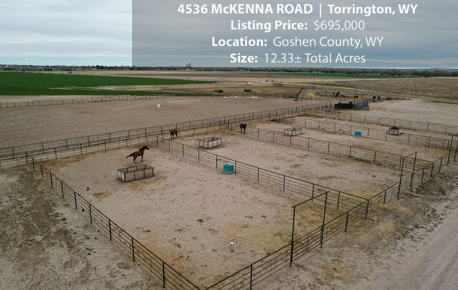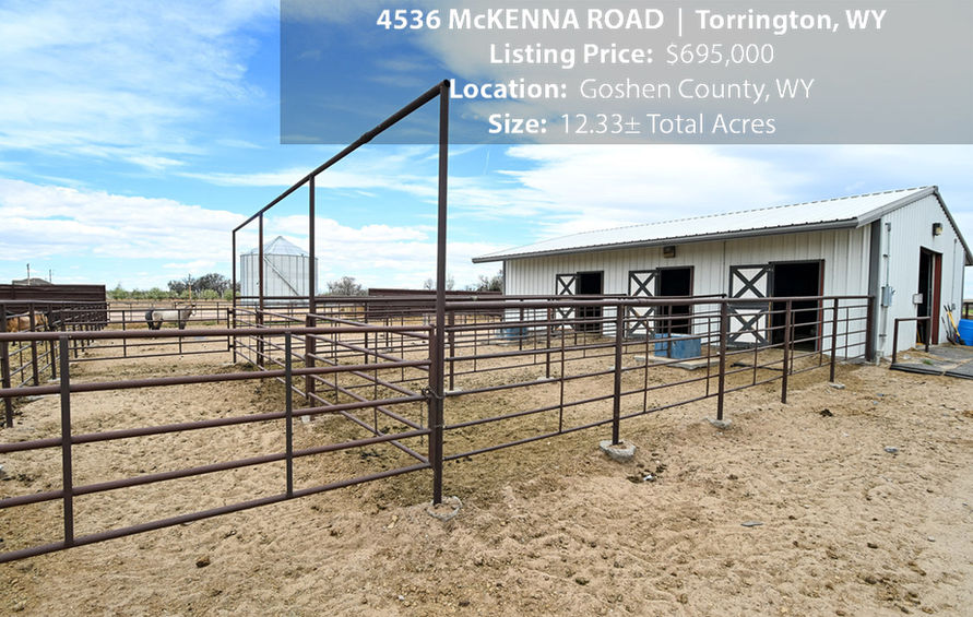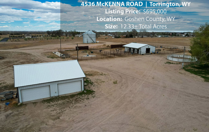 The property at 4536 McKenna Road is exceptionally versatile and checks nearly every box on a horse lover’s wish list. The home features 3 bedrooms and 2 bathrooms within 2,130 square feet of living space. Interior highlights include a combined game room/family room, a kitchen with an island bar and stainless steel appliances, and a primary bedroom with a refinished bathroom and a small office area that offers walk‑out access to the patio. An attached two‑car garage completes the home. The exterior improvements are equally impressive. The horse barn—surrounded by pipe‑constructed runs and pens—includes six fully enclosed box stalls with overhead hay storage. It is ideally suited for foaling mares or keeping sale horses under lights. The outdoor arena measures 275' x 400', is fully pipe‑constructed, and provides ample pen space for cattle or additional horses. The property also includes a small feedlot area with bunk space for approximately 200 head of cattle. All pens are equipped with automatic waterers. Rounding out the improvements at 4536 McKenna Road is a detached, fully insulated two‑car garage/shop with 220‑volt power. The property is conveniently located just minutes from downtown Torrington and a short drive from the Goshen County Fairgrounds.