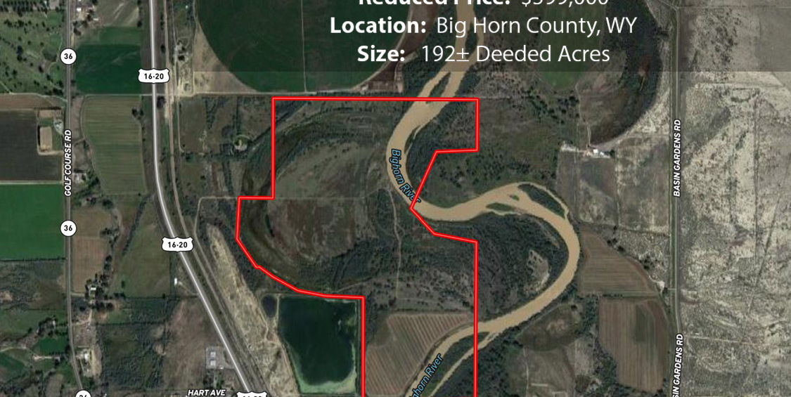 Located along the banks on the Big Horn River, this 192± deeded acre property lies just north of the town of Basin, Wyoming. Privacy and scenery are hallmark features of this river property with the added convenience of being on the edge of town. The property is comprised of tree-covered river bottom, open meadows, sub-irrigated riparian area, and 20± acres of flood irrigated alfalfa hay field. According to the Big Horn Canal Irrigation District, the property has a total of 111 acres of irrigation rights at an annual cost of $17/acre. There are no buildings, and the property has historically been used for cattle grazing and hay production. The grazing and farming are both available for the 2025 season. Wildlife includes pheasant, whitetail deer, mule deer, sandhill cranes, racoons, fox, and coyotes. Electricity is present on the property and is provided by Big Horn Rural Electric with a monthly service fee of $46.28. Domestic water can be sourced from a city water tap present on the property. There is insurable legal access to the property. This is a rare opportunity to own a large parcel of river property with irrigation suitable as a hunting retreat, small farm, or country acreage.