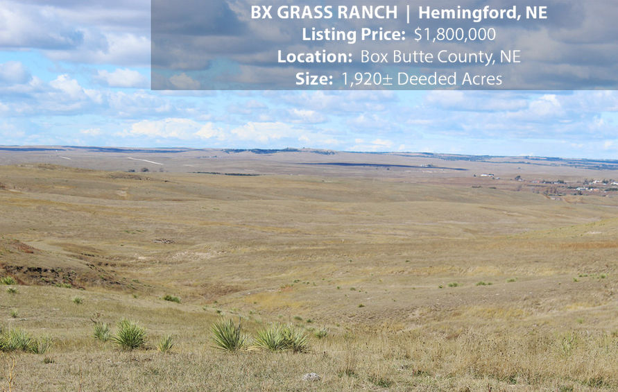 The BX Grass Ranch is an exceptional ranch located in the heart of the Nebraska Sandhills near Hemingford, Nebraska. This property consists of 1,920± deeded acres of productive grassland with rolling hills and hearty native grasses, which provide strong grazing capacity and natural protection for livestock. Currently, the ranch is utilized as a cattle operation for approximately 135 head of cow-calf pairs during the grazing season. The ranch is well-watered with five livestock wells and tire tanks strategically placed throughout the property, ensuring consistent availability to water across all pastures. Improvements include a modest set of working corrals and the ranch is fenced and cross-fenced for efficient pasture rotation. In addition to its ranching potential, the property offers excellent hunting opportunities, with elk and deer seasonally seen throughout the ranch. This is a rare opportunity to own a well-balanced, productive ranch in western Nebraska.