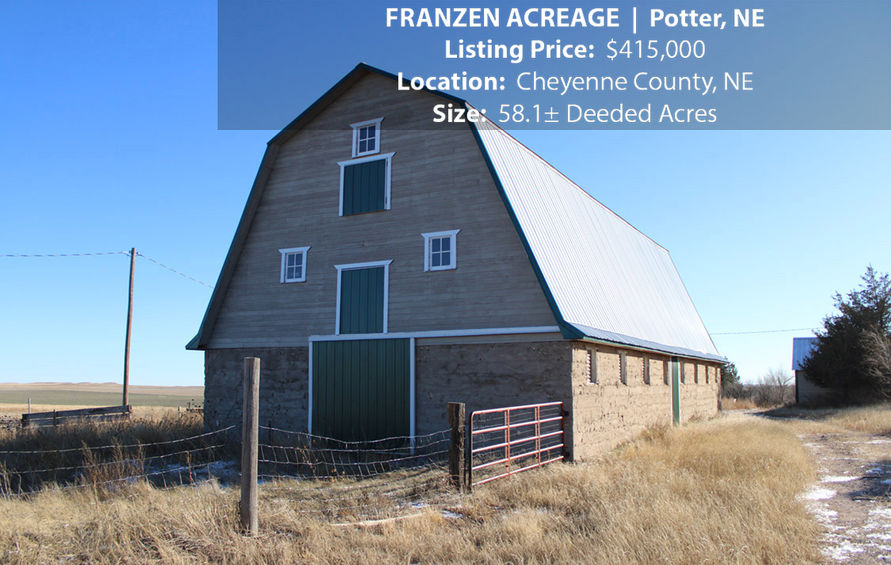 This contiguous 58± acre country property is located approximately 6 miles southwest of Potter, Nebraska. The terrain offers gently rolling hills with evergreen and deciduous trees amongst the heavily sodded grass pastures. The property features a 1,684 sq. ft. farmhouse built in 1926 with attached garage, and updates to include air conditioning and a newer furnace. Other improvements include a historic wood barn built in 1916 along with two shop buildings both with propane heat and the lower shop has three phase power. This quaint and private country property offers country living while being minutes from town that greets visitors with a warm and friendly welcome. You can enjoy the beautiful sunsets from the Franzen Acreage sitting on the porch amongst the deer, antelope, and pheasants that frequent the property.