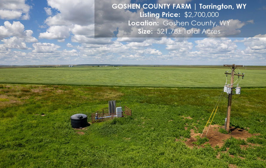 The Goshen County Farm is situated approximately 30 miles northwest of Torrington, Wyoming, and approximately nine miles east of Jay Em, Wyoming. The farm consists of 521.78± deeded acres of which 420.3± acres are irrigated under three low-pressure center pivots. Most recently, the north pivot is planted a one-year old stand of alfalfa and the remaining two pivots are currently used for high-intensity rotational grazing, but have historically been used for variety of crops including alfalfa, corn and sunflowers. There are two irrigation wells ranging from 350 to 400 feet in depth with static water levels around 200 feet. The irrigation well that provides water to the north pivot produces 750 GPM while the second well produces approximately 725 GPM. This second well provides water for both the center and south pivot. The domestic water well was drilled and completed in 2013 at a depth of 300 feet, static water level of 200 feet, and producing approximately 10 GPM. In the past two years, several upgrades have been made to the pivots including new master panels, underground center drives, gear boxes and sprinkler heads and the wells have been updated with new bowls and motor service. Improvements on the farm are well-maintained and include several outbuildings along with two 50,000 Sukup grain bins. The 1,440 sq. ft. Morton home has one bedroom, one bath, and includes a modern kitchen and appliances, and office.