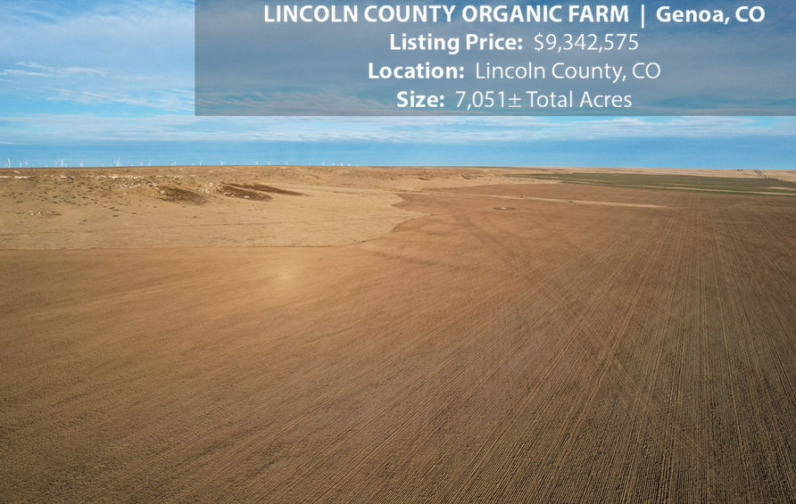 Located on the Eastern Plains of Colorado is the expansive Lincoln County Organic Farm, consisting of 7,051± contiguous acres. Historically used to graze livestock, approximately 5,890± acres were converted to dryland organic wheat ground, with the first harvest taking place in 2025. The property was further diversified for the upcoming 2026 with farm ground planted in organic wheat, triticale, sunflowers and millet, with some ground left to volunteer crops. The current owners estimate there are approximately 1,100± acres that remain in native grass which have been used to graze cattle. There are five wells located on the property, with an extensive pipeline network to 13 livestock water tanks located throughout the property. Access is provided via four miles of Colorado Highway 109 along the western boundary of the property with an additional five miles of county road frontage throughout the property.